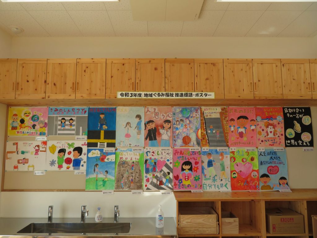 令和3年度 地域ぐるみ福祉推進標語・ポスター入選作品を展示しています2021/11/222023/02/28 ただいま児童館では、「令和3年度 地域ぐるみ福祉推進標語・ポスター入選作品」の展示をしています。 地域ぐるみ福祉活動を推進することを目的に、市内小学校4年生・5年生・6年生の児童から、地域住民に呼びかける福祉の標語・ポスターを募集しました。 作品テーマは「助け合い」「思いやり」「親切」です。 いつもと違う雰囲気の集会室で子どもたちも活動しています。 11月30日(火)までの展示です。ぜひ1点1点ゆっくりご覧ください。 特別企画