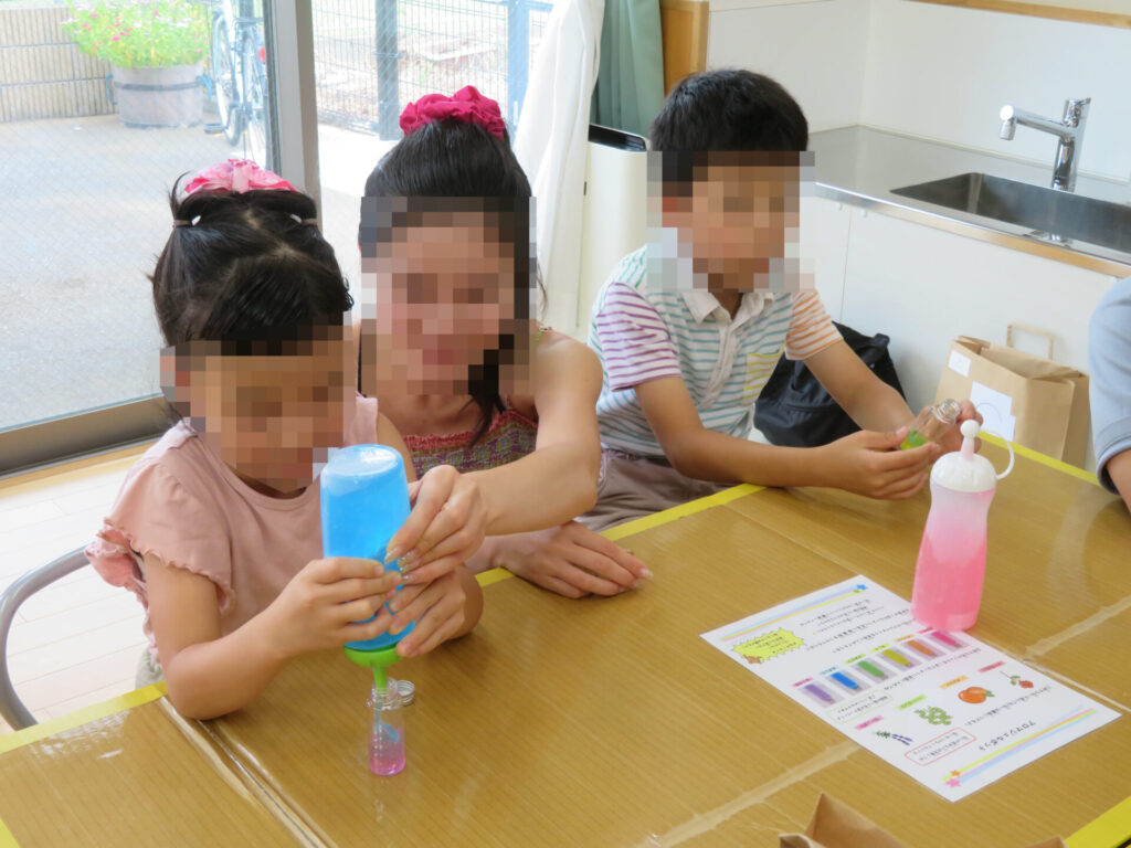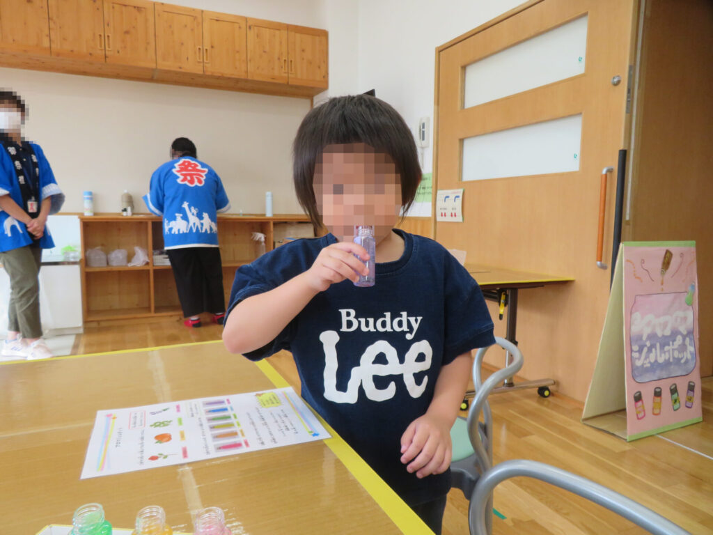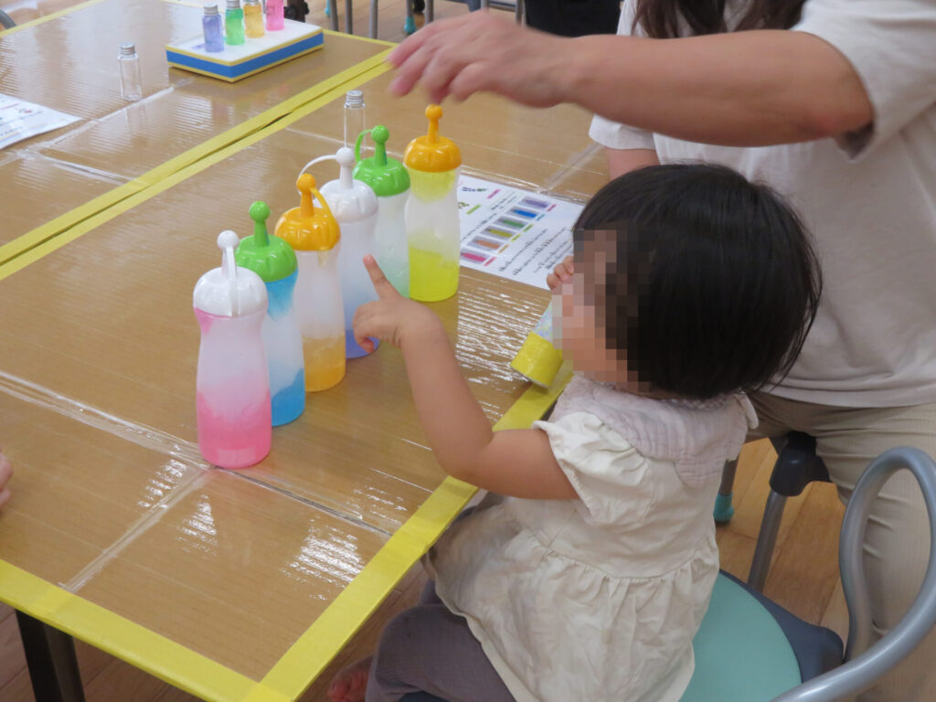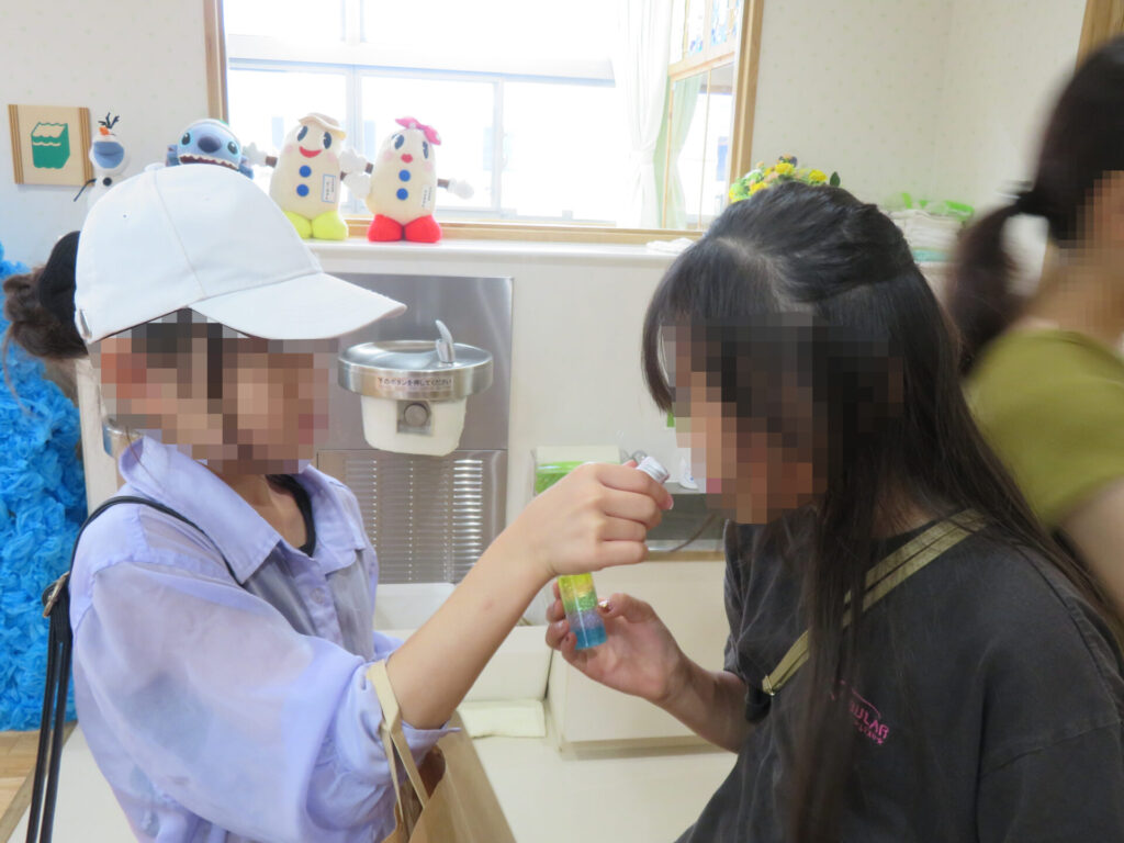 一色をめいっぱいボトルに入れる子、綺麗な層になるように全部の色をバランスよく入れる子、一色をメインで入れてアクセントに他の色を入れる子、一人ひとりの個性あふれるボトルが完成🎀