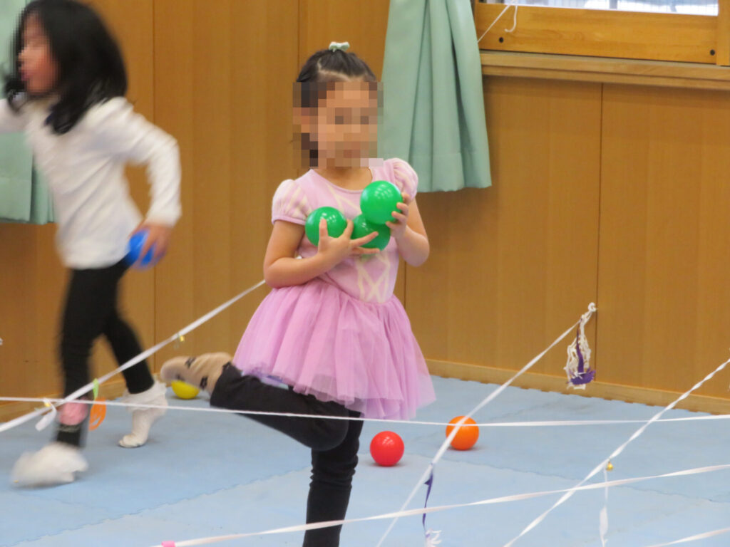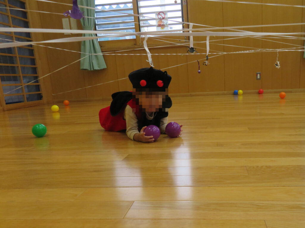 くもの糸に当たらないように、くじで引いた色のボールを取りに行くよ🔴