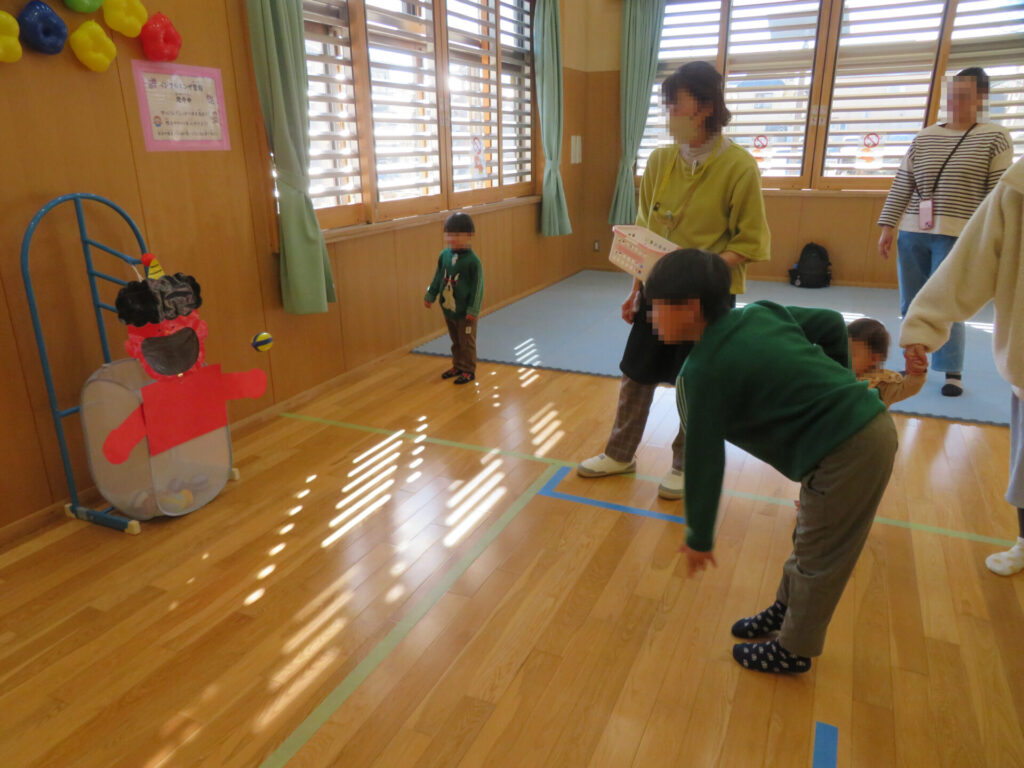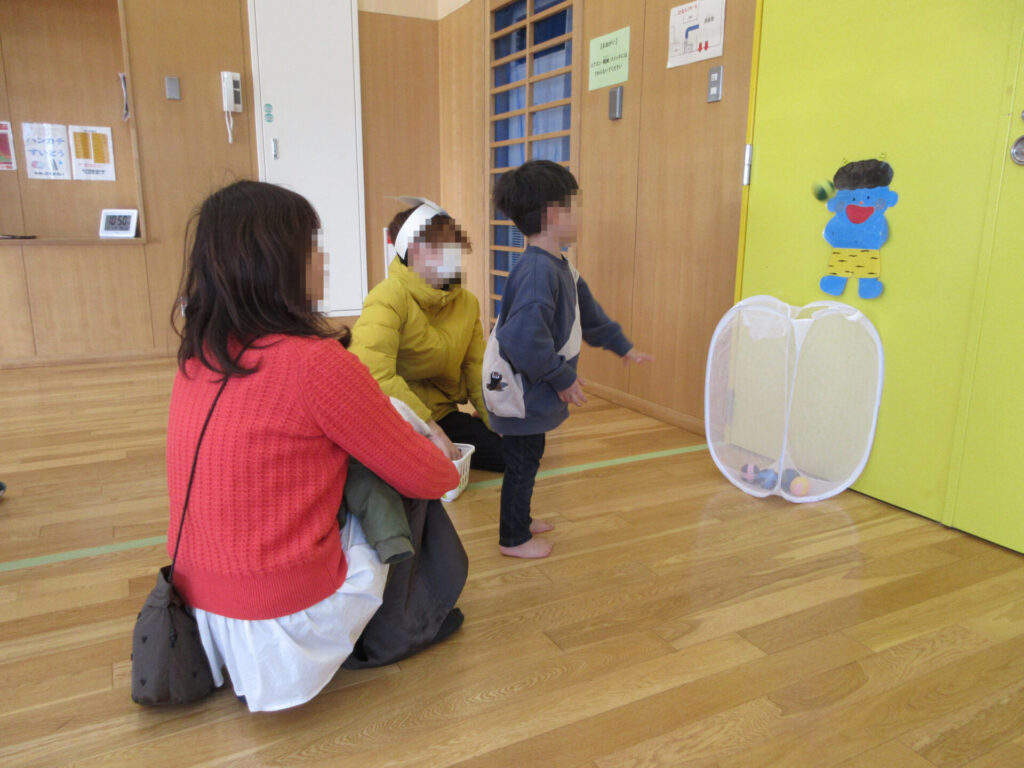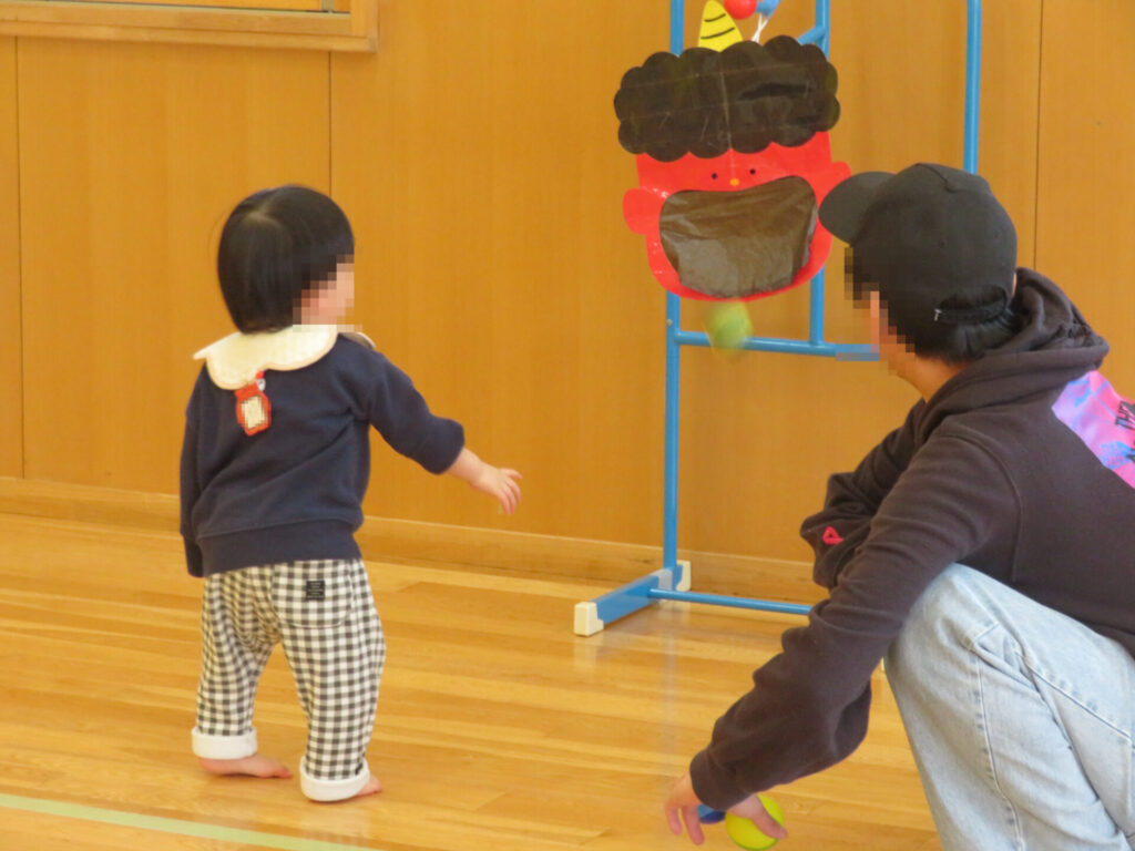 ママとパパに見守られながら大豆ボールをえいっ!