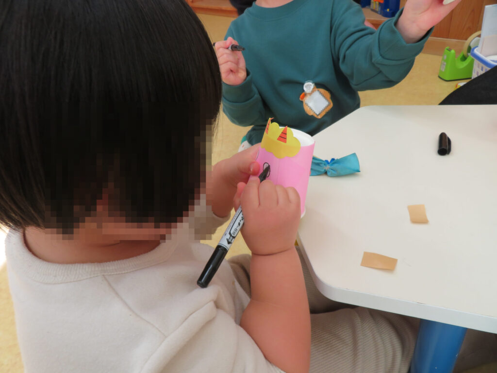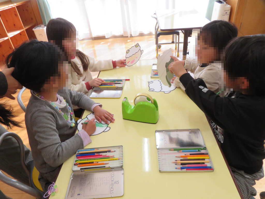 みんな初めて会った子だけどすぐに仲良くなって、鬼のお面も一緒に作成💖