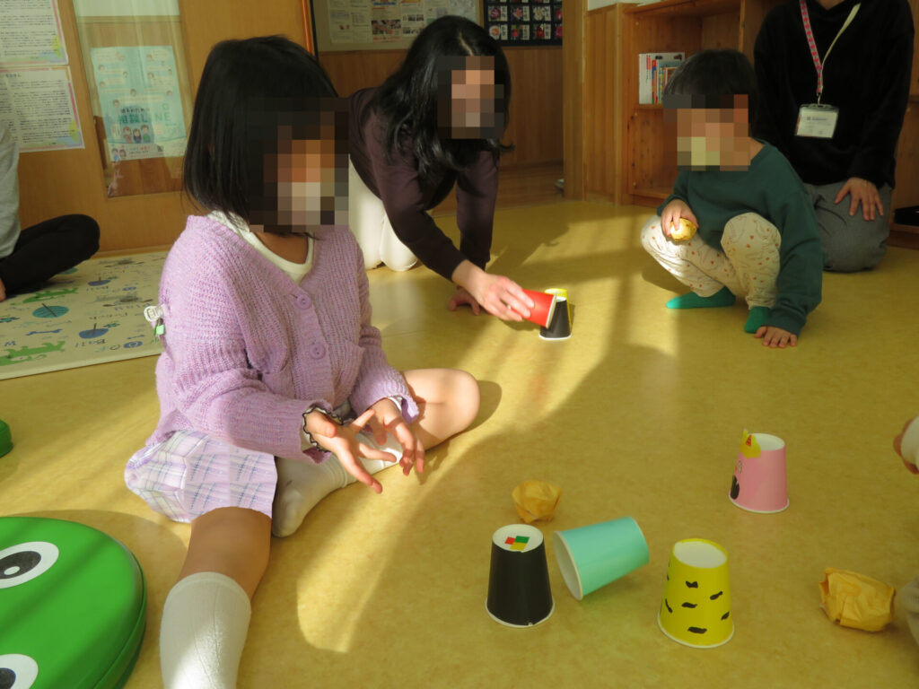 的当てをしたり紙コップの中に大豆ボールを隠して当て合いっこをしたり積み重ねたり…